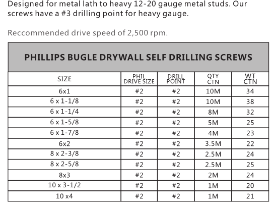 Phillips Bugle Drywall Self Drilling Screw