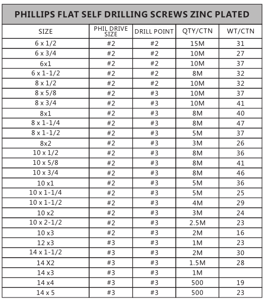 Phillips Flat Self Drilling Screws